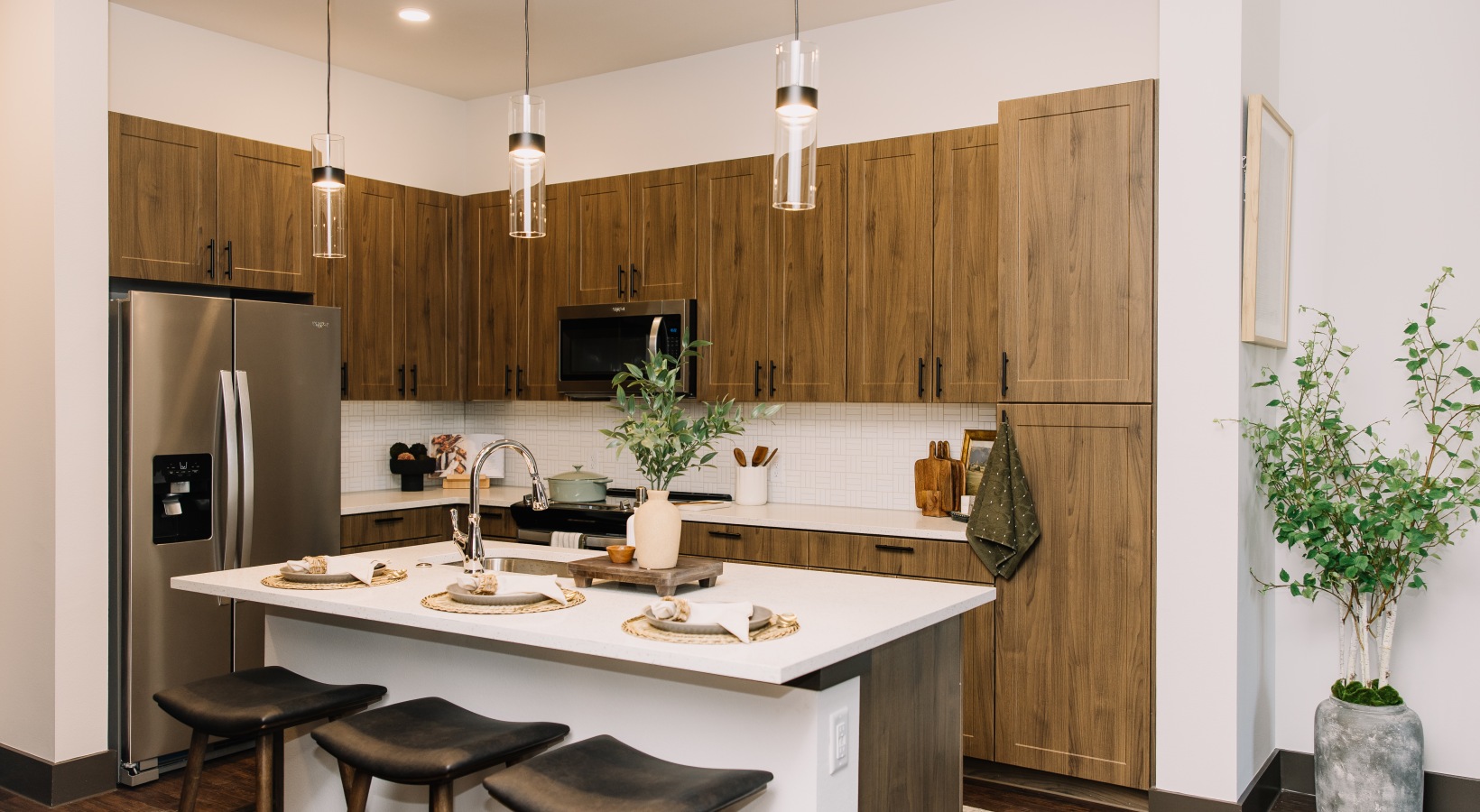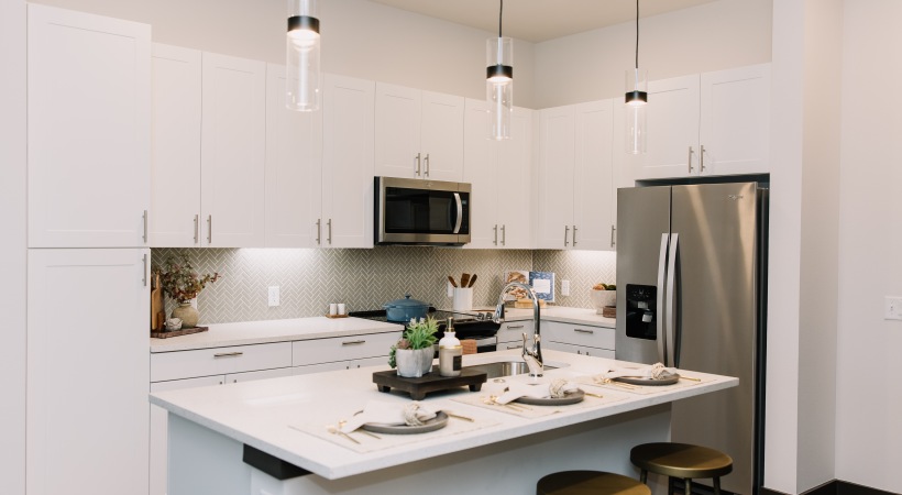 • kitchen in the cool scheme at The Harden senior apartments in fort worth